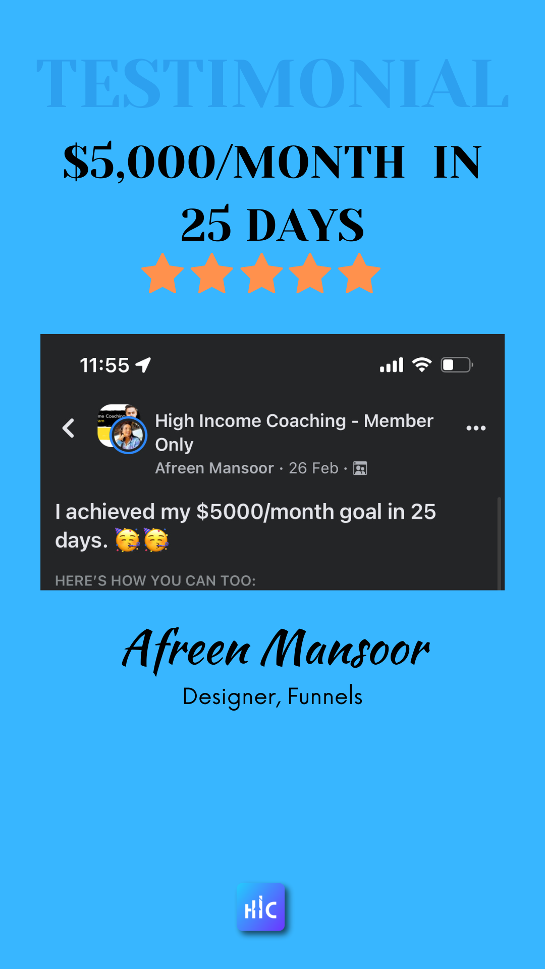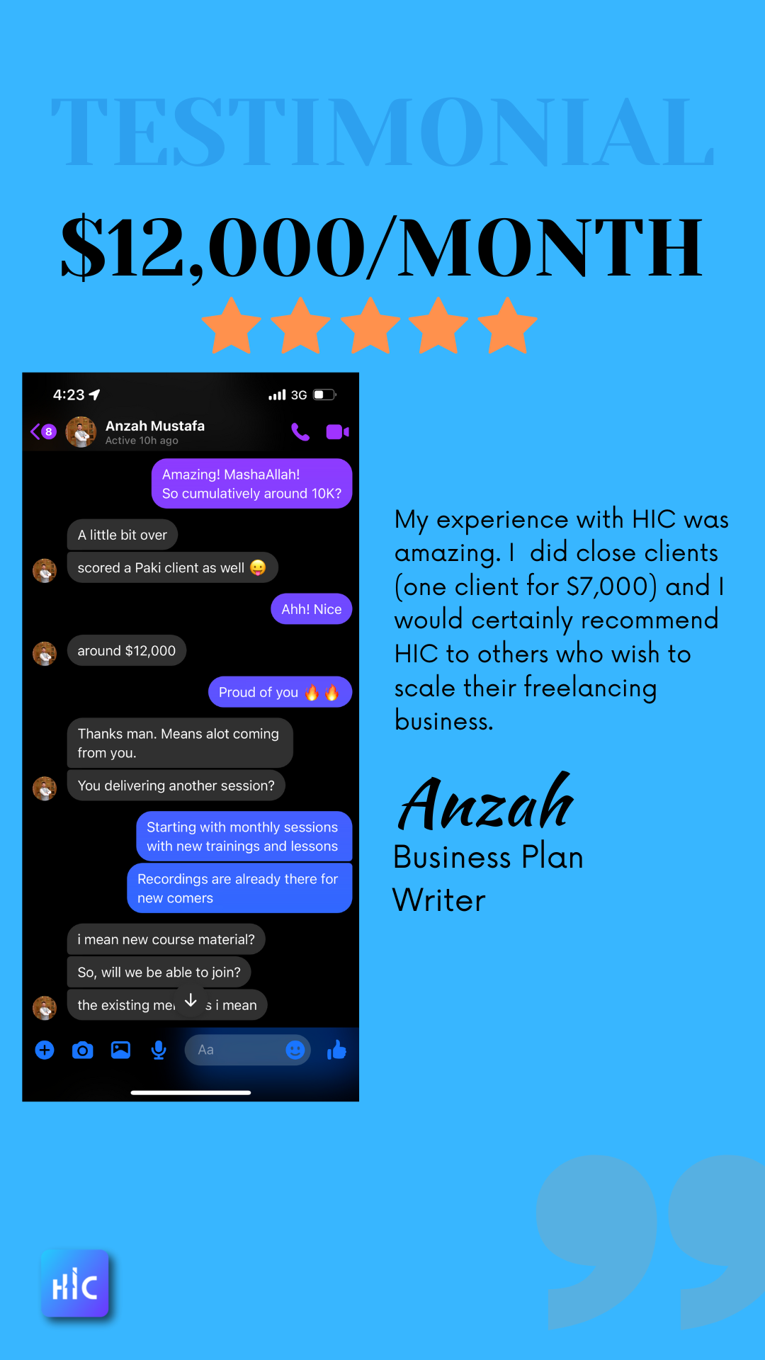 Anzah earned $12,000.00 in a single month thanks to the simple Client-Acquiring techniques I have taught in the HIC 2.0.